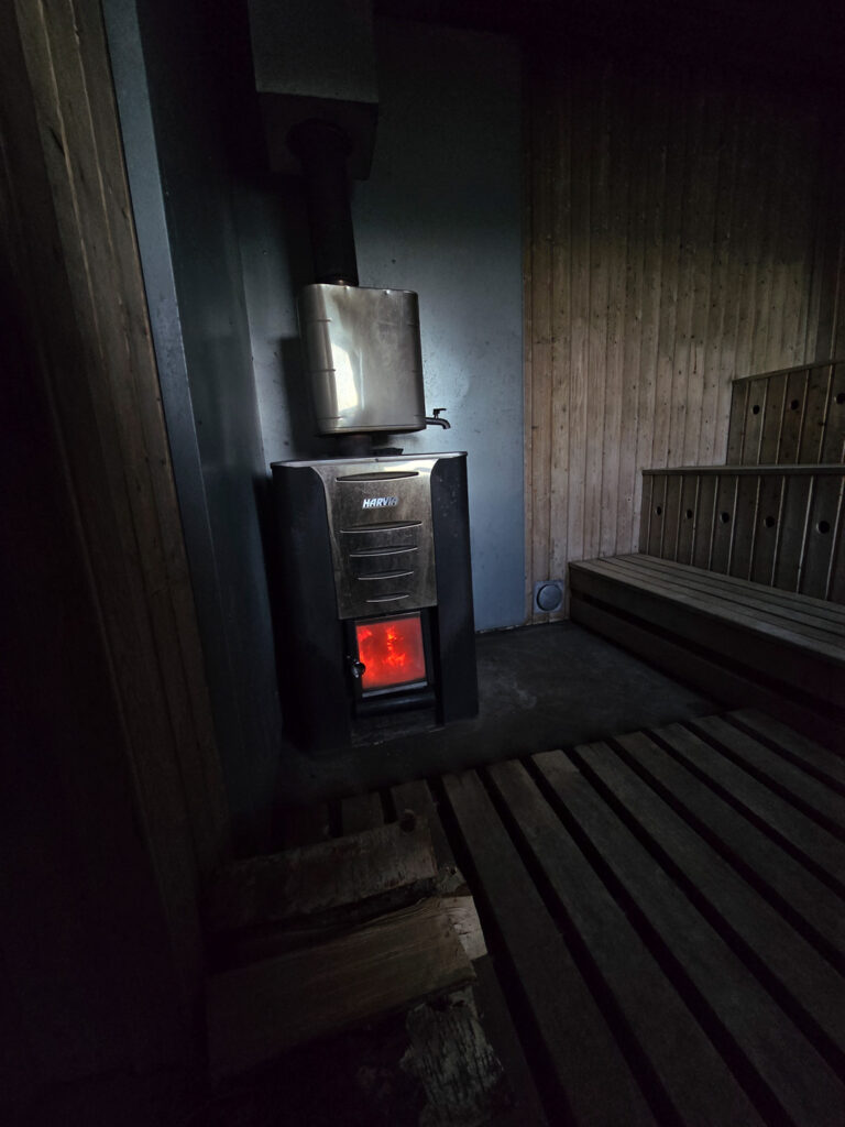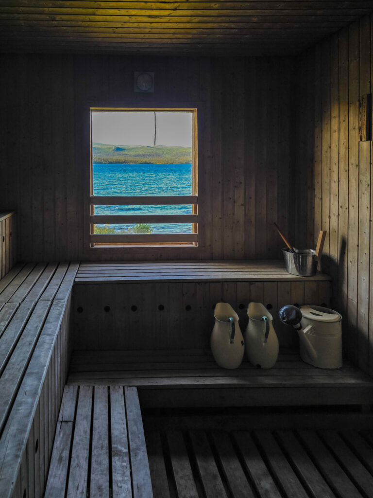 Efter middagen har jag bokat den vedeldade bastun och den är minst sagt fantastisk. Jag älskar att bada bastu. Saltolouktas vedbastu är ganska stor och har utsikt mot sjön Langas. Jag tar flera dopp i det kalla sjövattnet och låter kroppen värmas upp i bastun däremellan. Går inte att få bättre återhämtning.