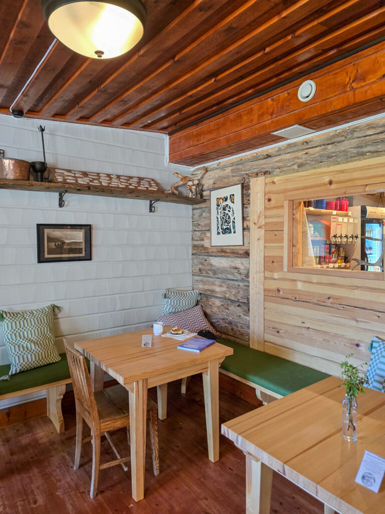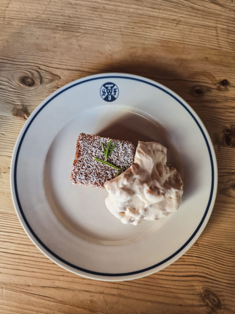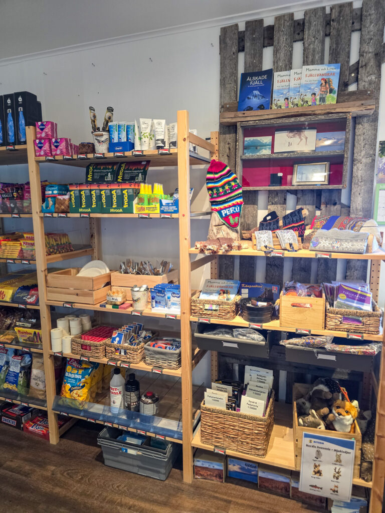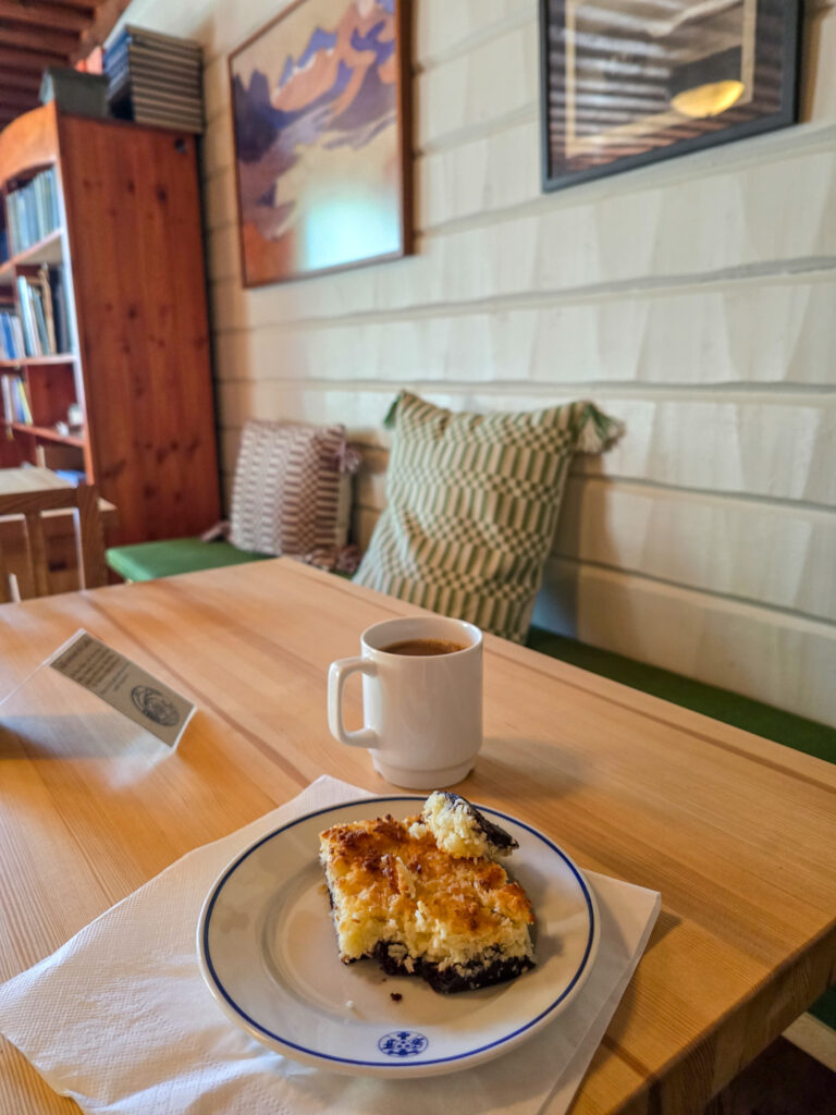 En halv vilodag väntar och jag ska bo inne på stationen. Jonathan välkomnar i receptionen och snart har jag lämnat packningen, bokat vedeldad bastu och slagit mig ner med hembakad Toscakaka och kaffe. Fjällstationsmiddag väntar också. Trots allt härligt ser jag fram emot frukosten. Jag älskar fjällstationsfrukost på vandring.