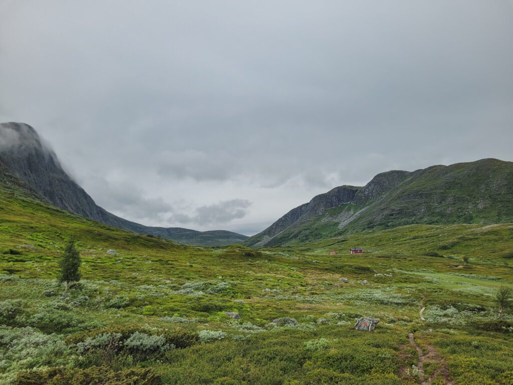 Improviserade lite rätter och bestämmde att det var värt att bära 2,5 dl kokosmjölk upp på fjället. Gick sedan till Hotell Klimpfjäll och käkade en väldigt, väldigt god lunchbuffé. Inte gratis men kändes som om jag åt för två. Minst. Värt! Kunde också ladda powerbank och mobil medan det regnade utanför. Blev en rejäl siesta men i efterhand så värt det eftersom jag sen fick bra sikt i Durrenskalet till skillnad mot en annan Bandare jag mötte i Tjåkkelestugan. Hon hade inte sett nått av det vackra och dramatiska skalet.
