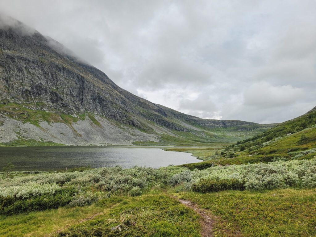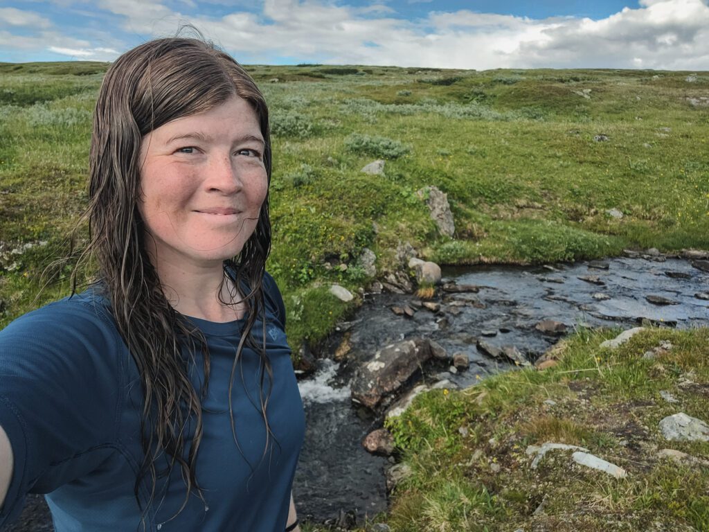 Genom björkskog och snår, uppåt uppåt men ack så värt det. Utsikten mot Norge var hänförande men hopplöst att fånga med mobilen. Trist att inte ha en riktigt bra kamera på äventyret men nån måtta får det vara på att släpa grejer. Fortsatt ingen mobilmottagning (den tog slut vid rastskyddet Durrenstugan) men jag njöt i ensamheten. Tog en rast vid en bäck och tvättade håret. Tänkte det skulle hinna torka i den solvarma vinden under kvällens vandring.