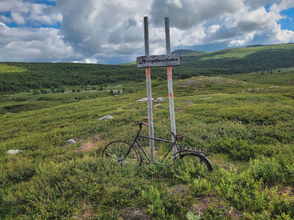 I efterhand hade jag överlevt på det jag hade, särskilt som det finns en butik jag inte visste om i Boxfjäll, men det var med lugn i magen jag nu kunde ge mig av. Vandrade längs den fina Norgefararleden. Såg den berömda cykeln och vek sedermera av på Lapplandsleden mot Åtnikstugan. Efter en svettig stigning och utförslöpa tog jag lunchrast och Maria hann ikapp. Vi slog följe till stugan. Sedan tog jag en längre rast och hon gick vidare.