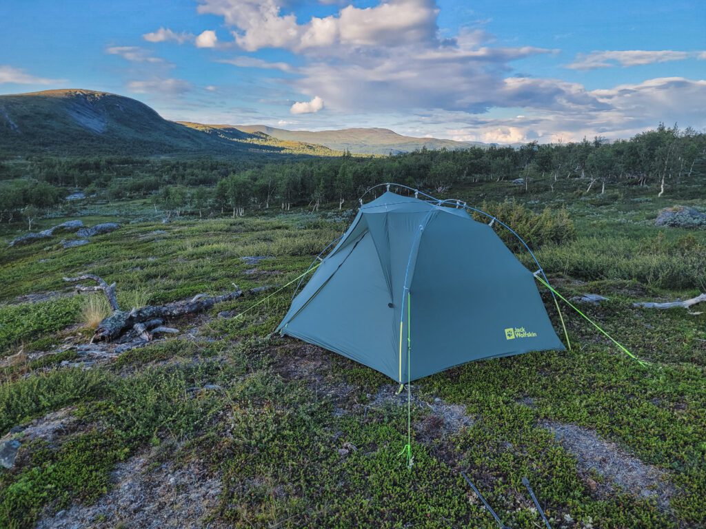 Tog mig nedåt, gick på stenar över en jokk med trasig bro och hittade strax därefter en fin tältplats. Hade fyllt vätskesystemet i bäcken så körde dusch med slang istället för bad eftersom det inte fanns rinnande vatten precis vid tältplatsen. Bra med kartrek innan, då är det värt att bära vatten kanske 500 meter till en fin tältplats. Gömde mig för myggen i tältet och njöt av en fin kväll.