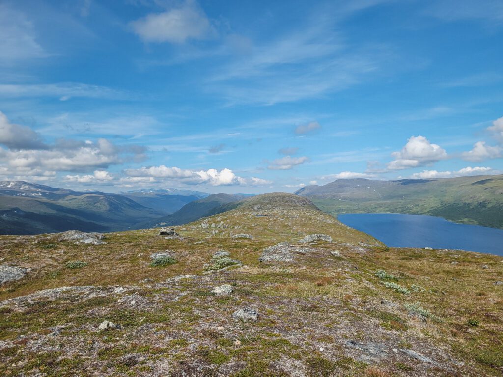 Vid sjöarna vid rengärdet passerade jag Maria på avstånd, såg hennes tält vid sjön men jag ville fortsätta och njuta av kvällen. Soligt, blåkupa. Då mår man. Tog middagsrast när jag kommit över ett krön så jag kunde se bortåt Skalmodal och Aamere. Upp dit imorgon alltså. Ser brant ut tänkte jag.