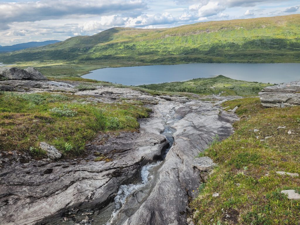 Såg fina bäckar på vägen ned som gröpt ur berget. Nere vid sjön sen fanns en strand och stigen bort till stugan Arevattnet var lätt att vandra.